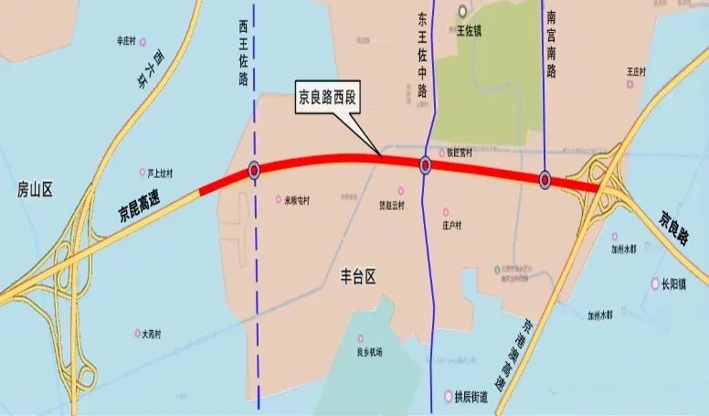 京良路西段西起京昆高速,东至京港澳高速,与现况京良路相接,全长3.73公里,其中丰台段长3.67公里。该路段按照城市快速路标准建设,服务周边道路就近接入城市快速路网,有助于进一步完善区域交通市政条件。
