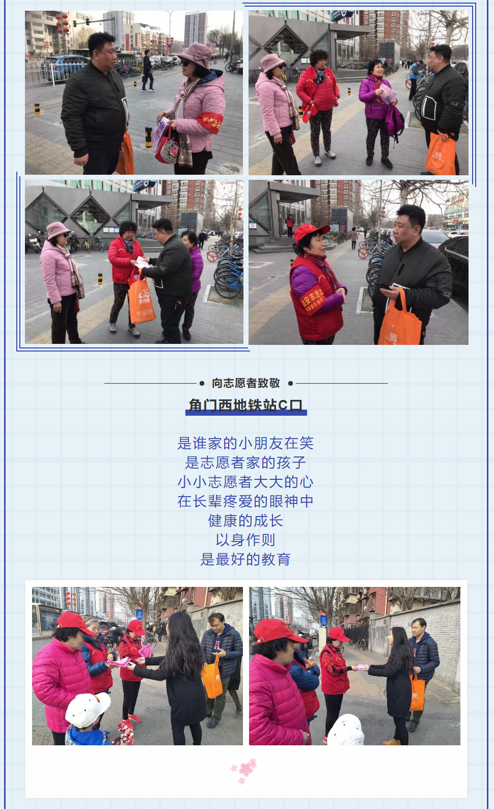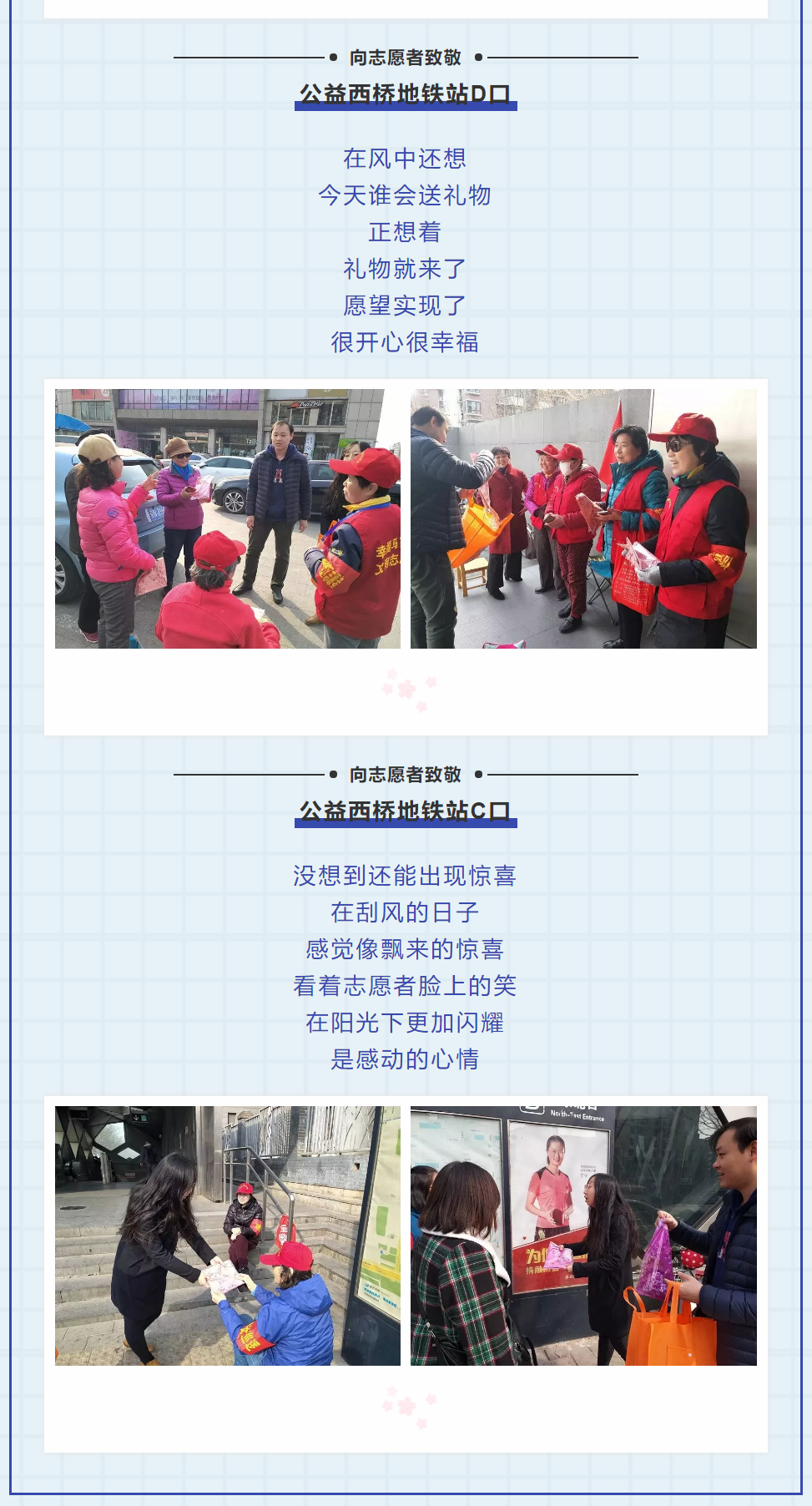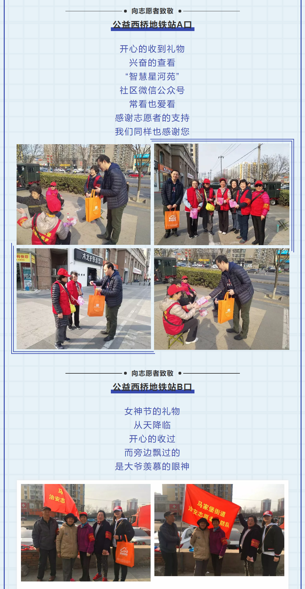 下午两点,公司工作人员两人一组,为马家堡站、角门西站、公益西桥站等十个地铁口的40余个女性志愿者们送去了节日的礼物——一条精美的丝巾,并对她们在节日中值守付出表示了感谢。