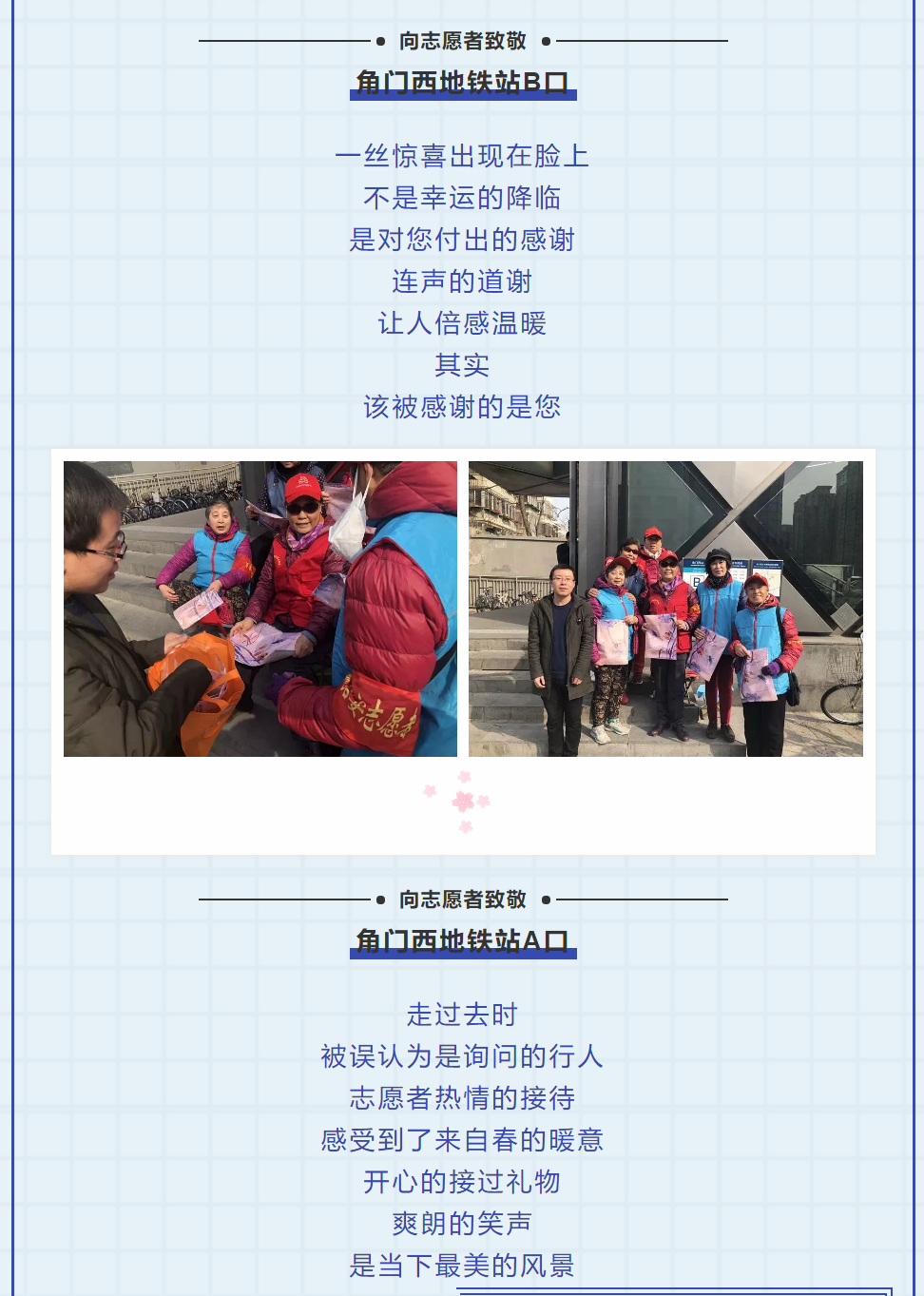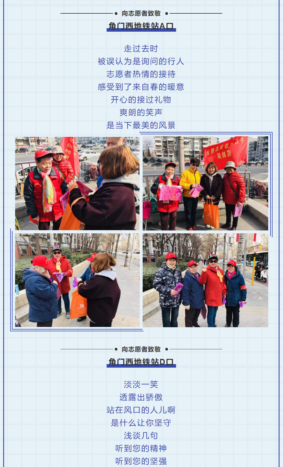 下午两点,公司工作人员两人一组,为马家堡站、角门西站、公益西桥站等十个地铁口的40余个女性志愿者们送去了节日的礼物——一条精美的丝巾,并对她们在节日中值守付出表示了感谢。