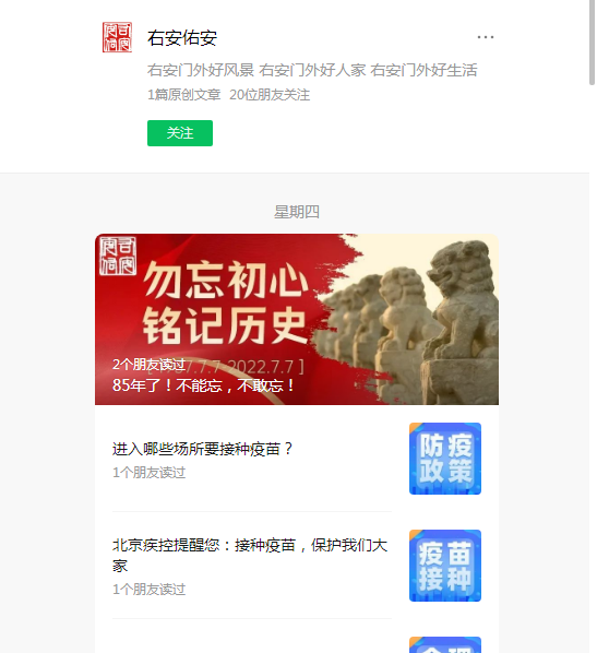 “右安佑安”公众号形成独有的运营特色,并吸引更多居民关注,为街道积蓄势能与声量,助推街道宣传新渠道建设。运营以来共计群发条数:398篇,共计阅读量431238人,留言次数超1000人次,点赞数超1000人次,在看数3000人次。其中《新一轮!新一轮!明天右安门请您来采样!》 阅读量超20000人;《有调整!进返京政策,最新梳理》阅读量超15000人次;《准备!准备!有关26日第三次全员核酸检测的通知》阅读量超15000人次。粉丝关注已超15000人!